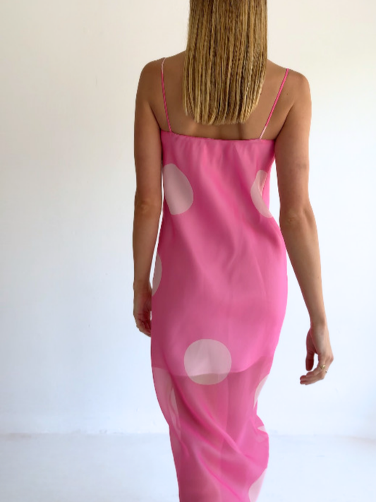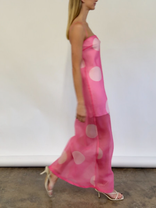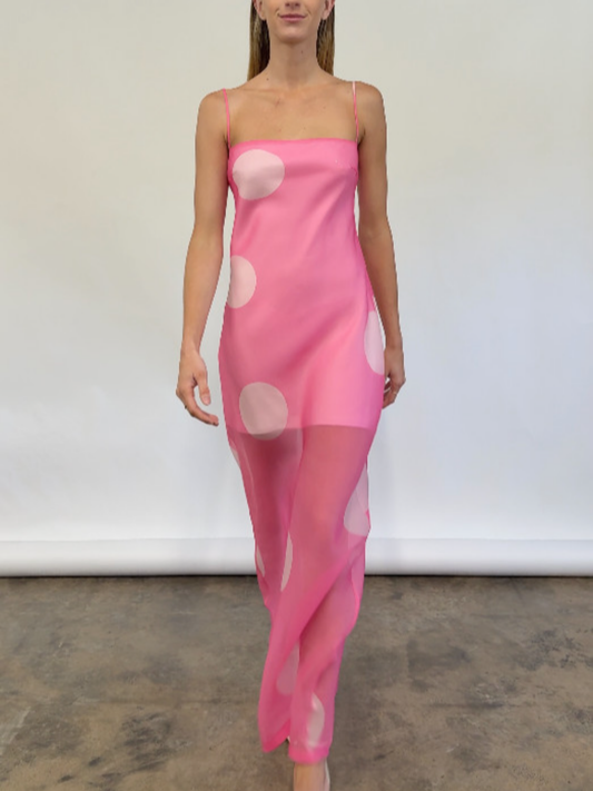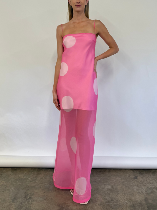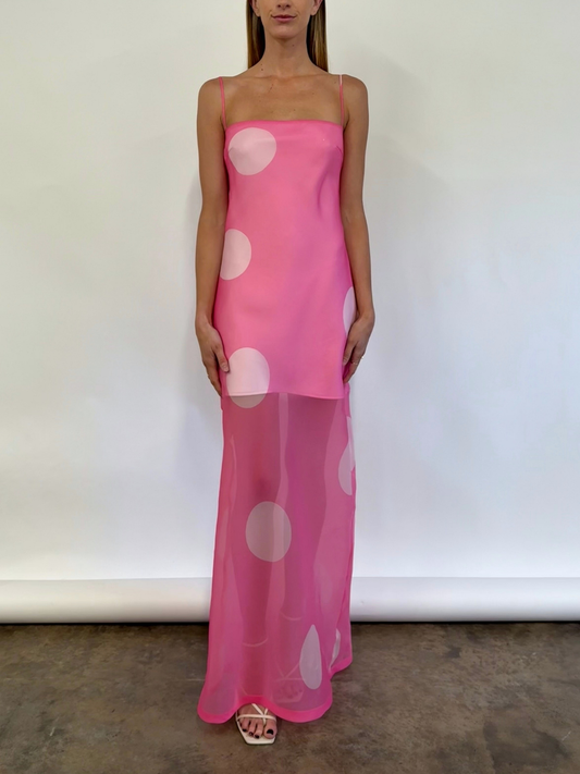 The Mila Maxi Dress is crafted from sheer organza with bold pink polka dot.