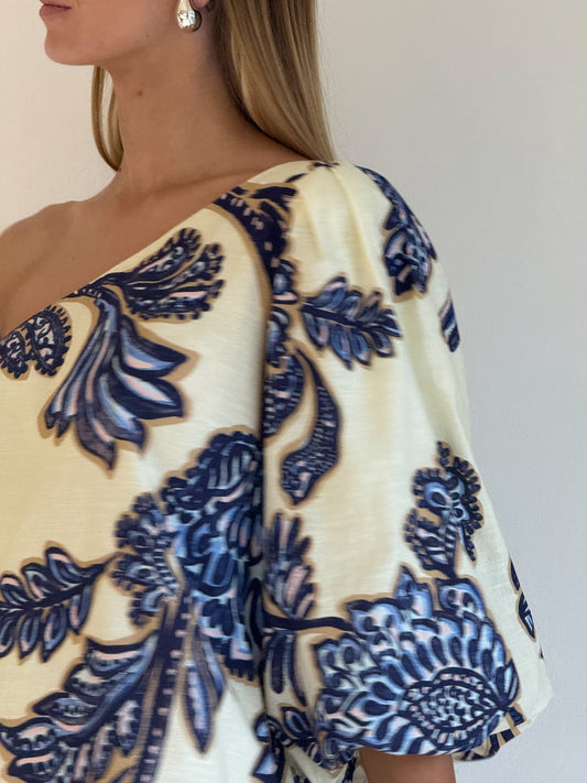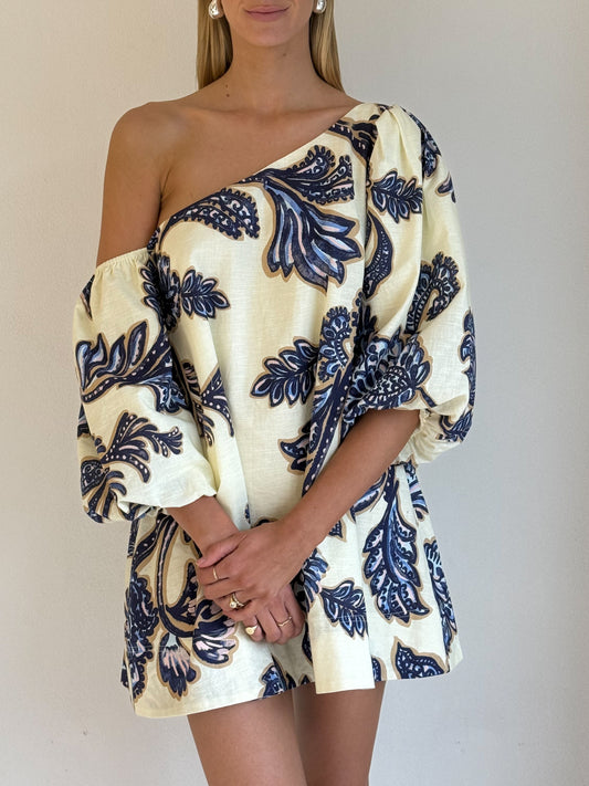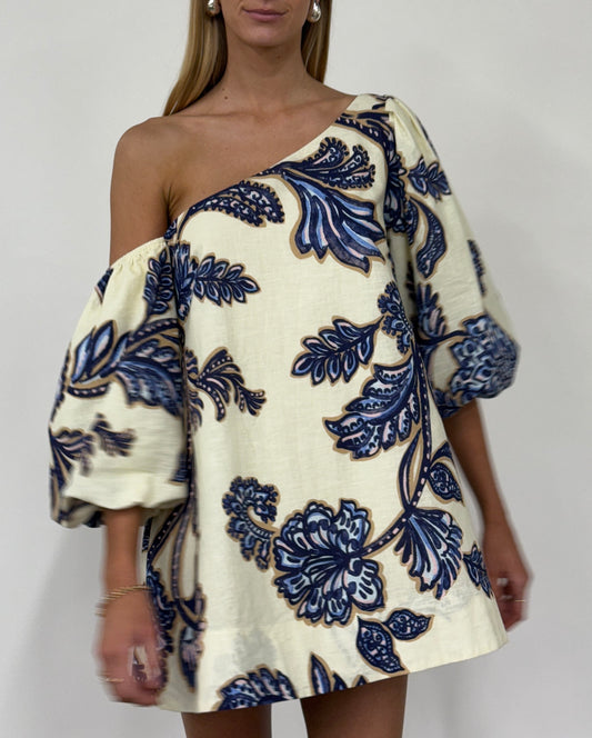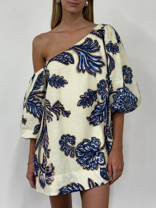 The Capri Mini in Blue Paisley is a light weight cotton linen blend designed to be a comfortable styling event dress. The Capri mini features an asymmetrical neckline with an off the shoulder sleeve for a relaxed look. The Capri is our staple mini style that is perfect for day events to evening dressed up with gold jewellery and heels.