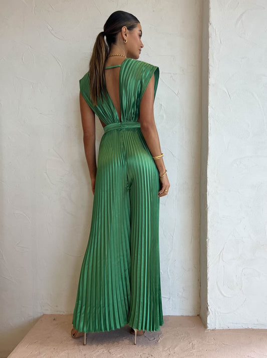 Designed with signature ribbed pleating in a ravishing Sea Green. The Gala Jumpsuit features a plunging V neckline and backline, deep armholes, and a cinched high waistline before falling into an umbrella pleat wide leg.