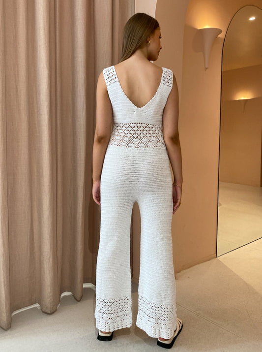 Handcrafted from a Cotton artisanal crochet, this jumpsuit features wide shoulder straps, a deep V-neckline detailed with buttons and flattering long straight legs that finish at the ankles.