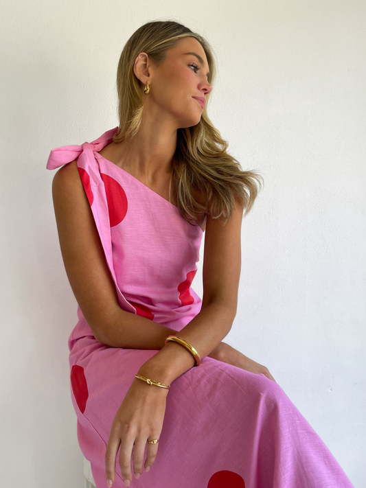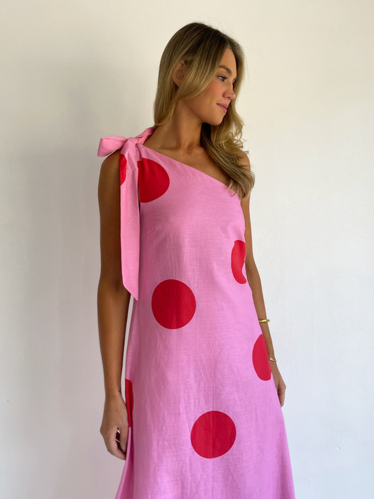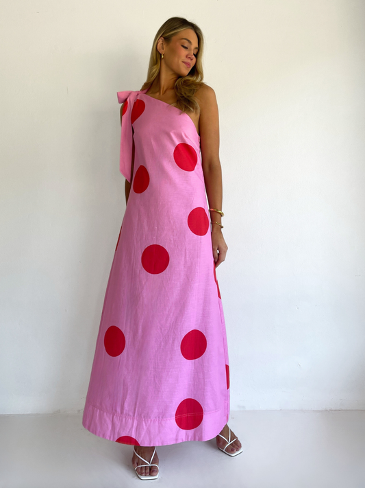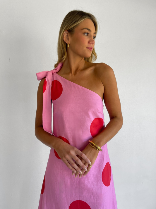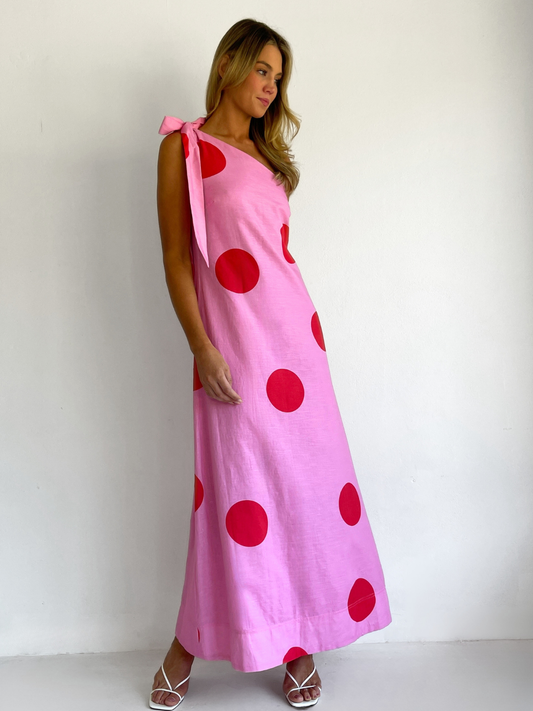 The Sorrento Maxi Dress in Pink & Red Polka from By Nicola is made from a cotton linen blend. Featuring a one shoulder neckline, self tie shoulder and relaxed A-line silhouette.