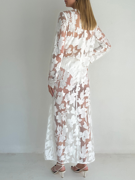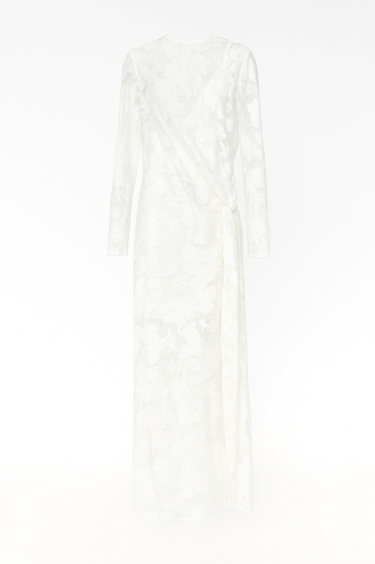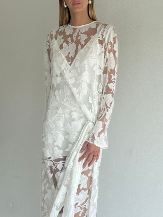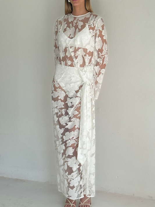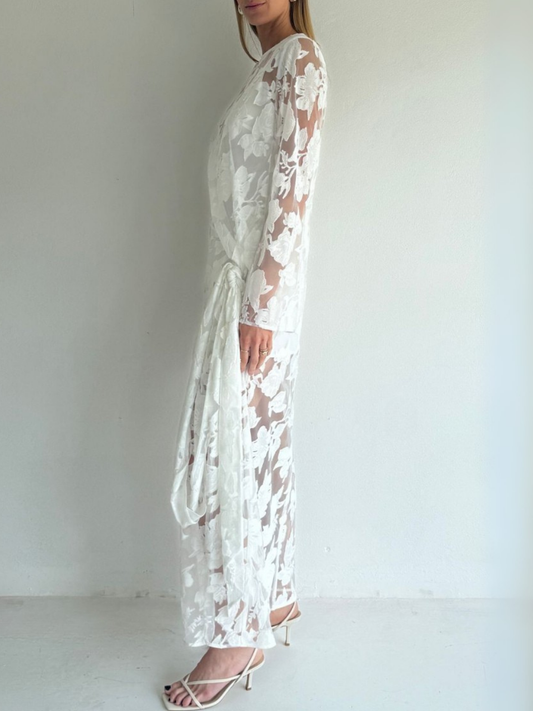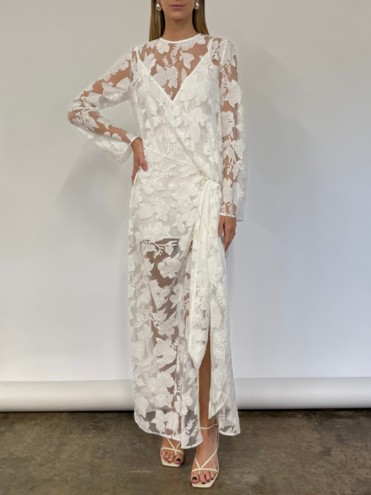 The Elodie Maxi Dress in White Lace features a left side twist detail for shape through the waist to the hip.