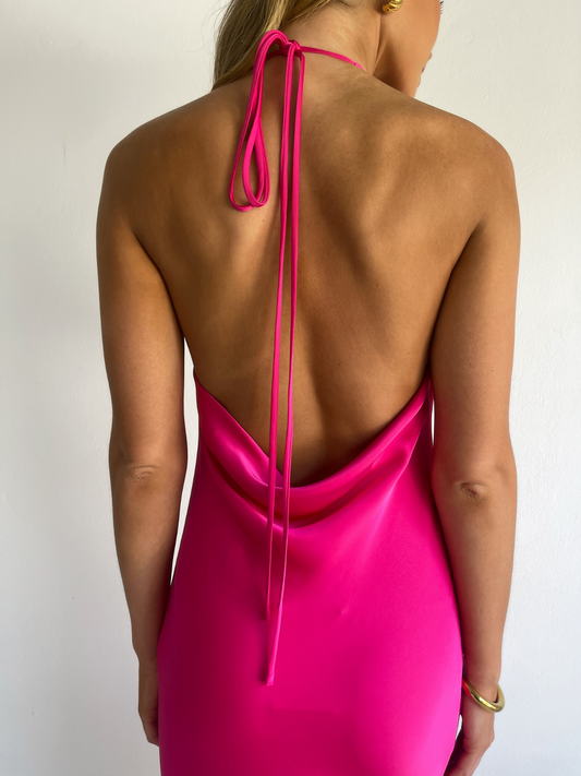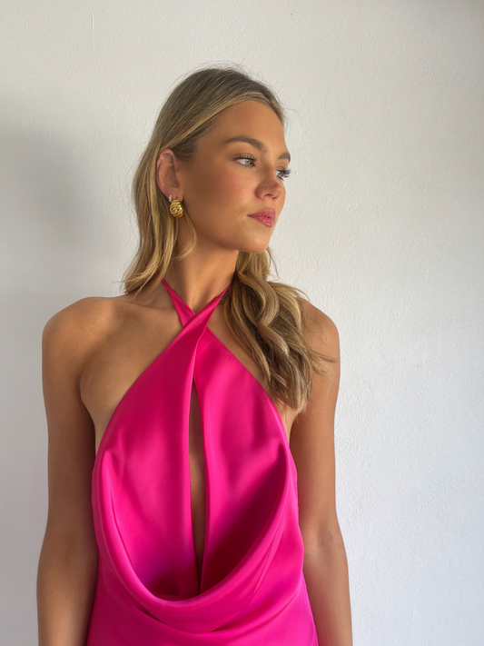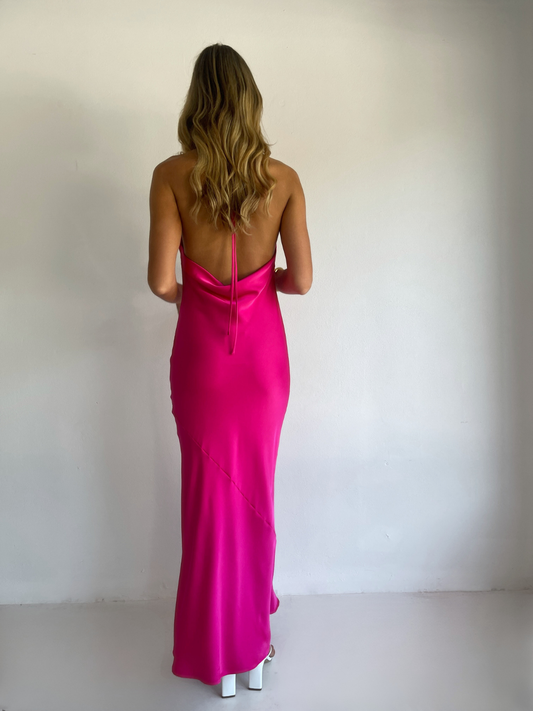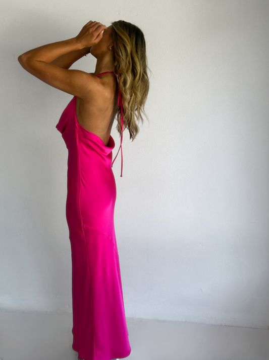The Lucia Maxi Dress in Fuchsia features a bias-cut silhouette with a soft cowl neckline that can be styled multiple ways.
