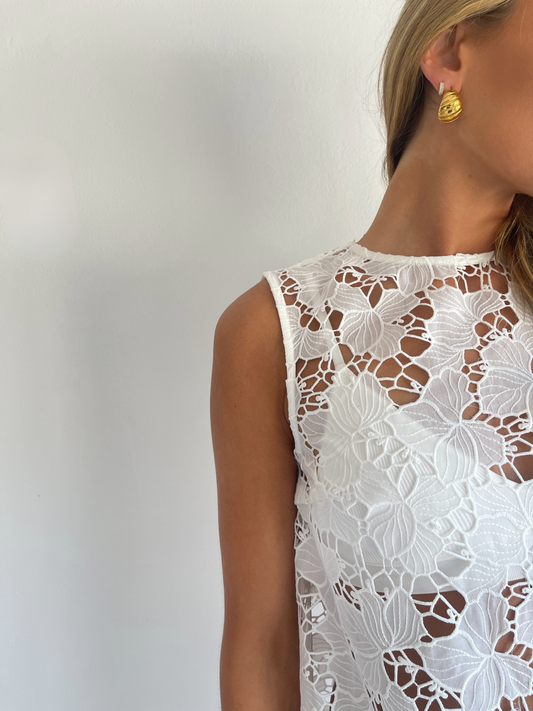 Made from a delicate embroidered lace this mini dress features a key hole opening at the back.