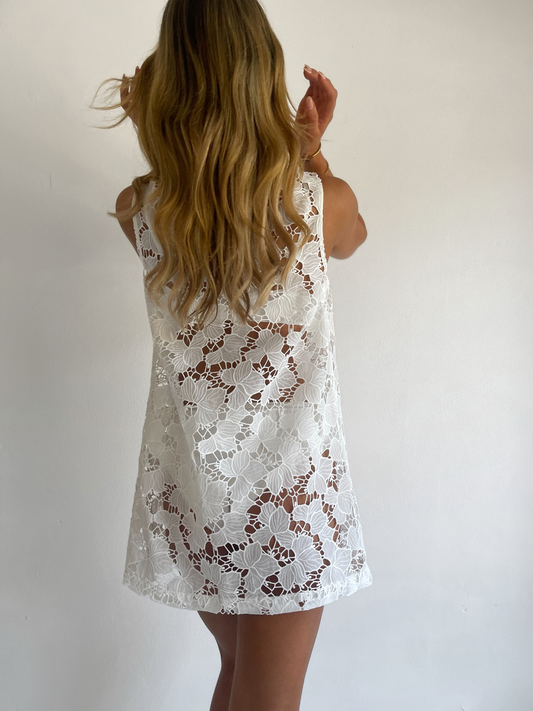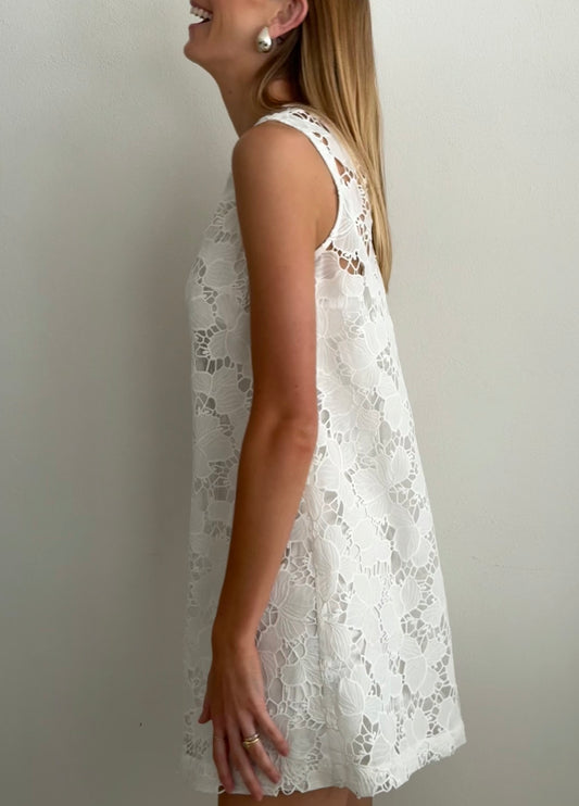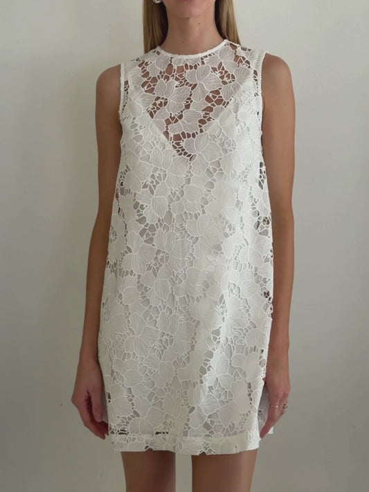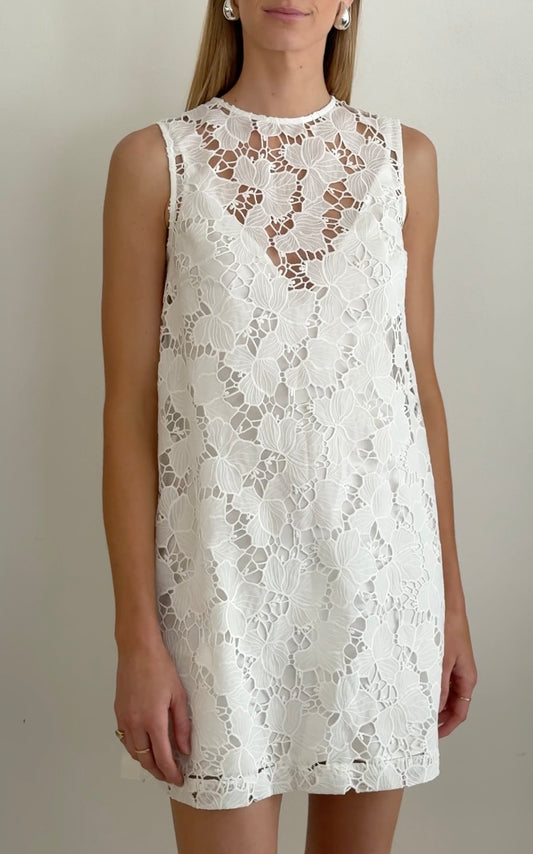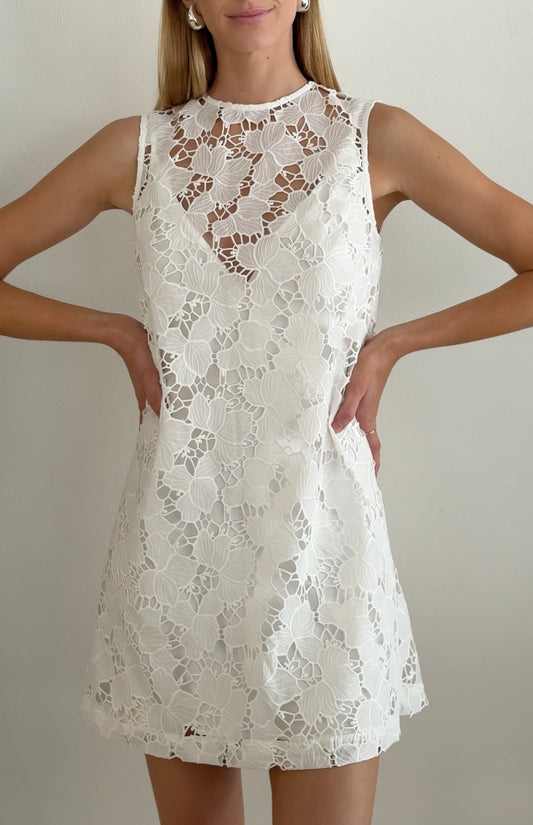 The Roux Mini Dress in white lace comes with a separate bias cut slip and features an a-line shape.