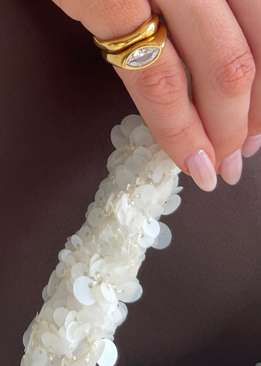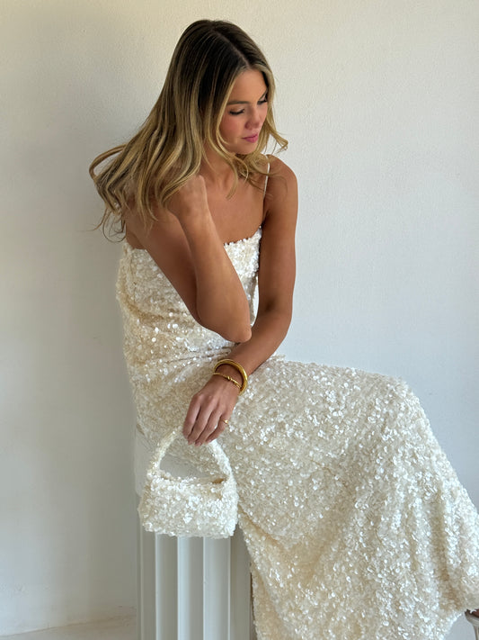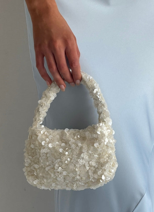 The Sloane Mini Bag in Ivory from By Nicola is made from a delicate dense sequin.