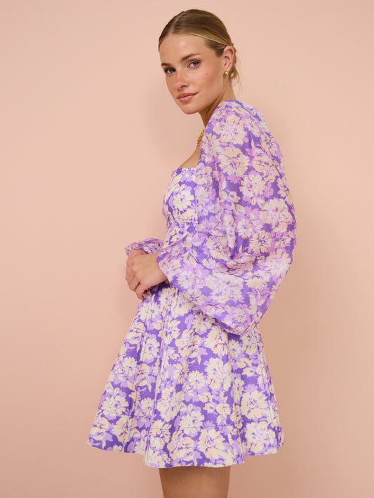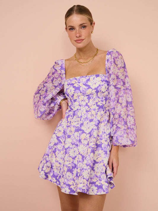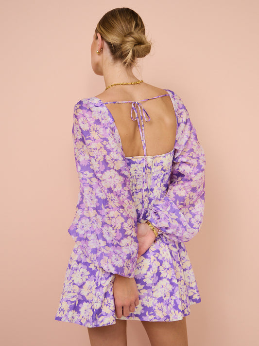 Crafted from a captivating violet print, this mini dress features a flattering square neckline, voluminous long sleeves and a beautiful open back with tie-detail.