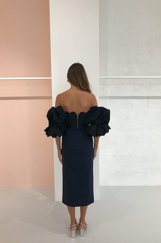 Beautifully tailored suiting is a signature design for Acler. The Aslo skirt is a high waist midi with tortoiseshell button and scalloped edge detail. This skirt is the perfect trans-seasonal piece with a modern twist.