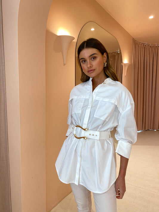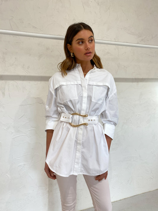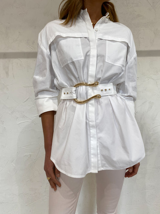 Featuring an exclusive harp shaped gold buckle belt and pocket detailing this oversized shirt will fast become a wardrobe essential.