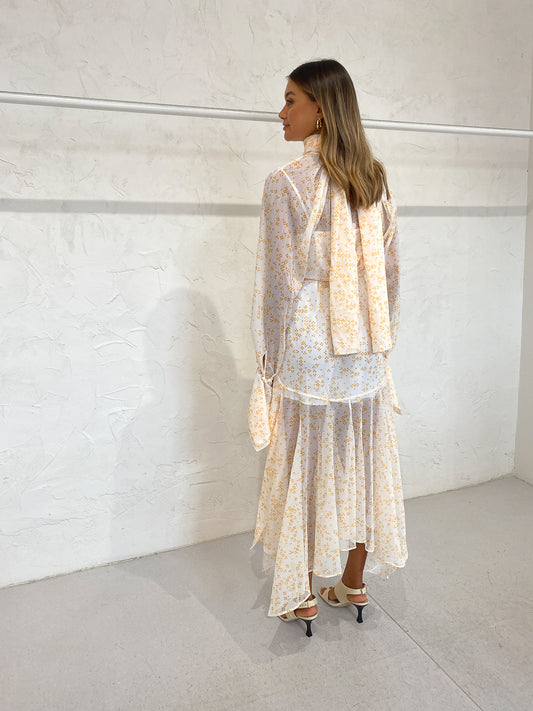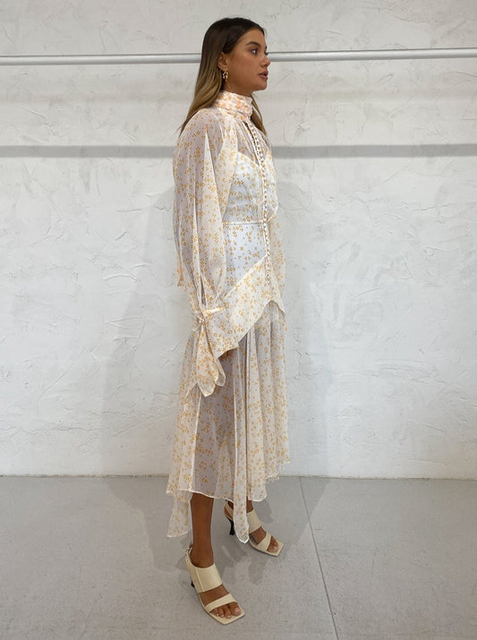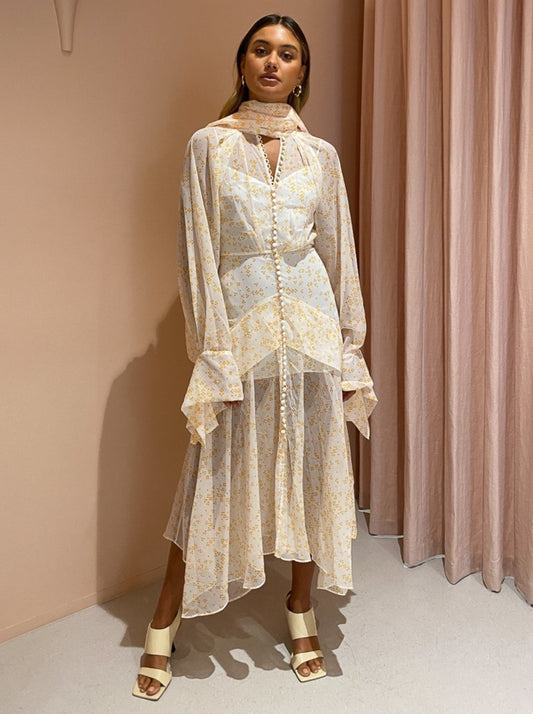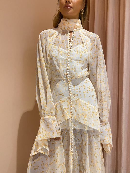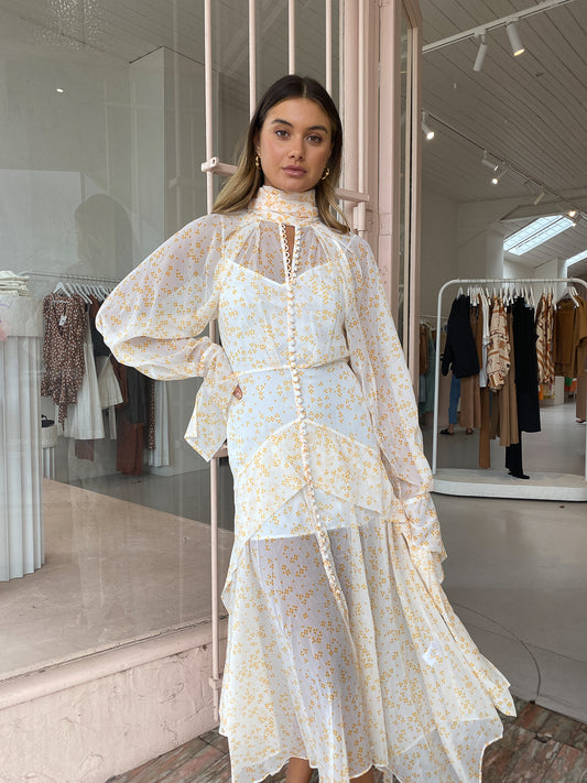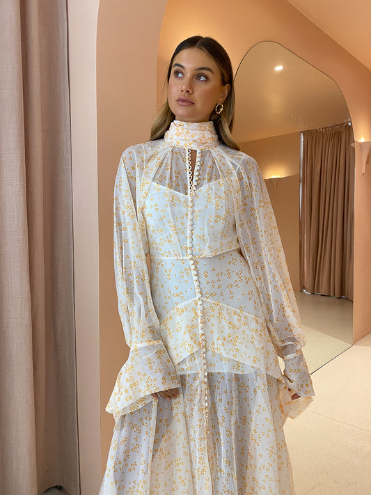 The Cathedral Dress in Yellow Spot from Acler has us falling in love with semi-sheer styling with a modern ethereal touch.