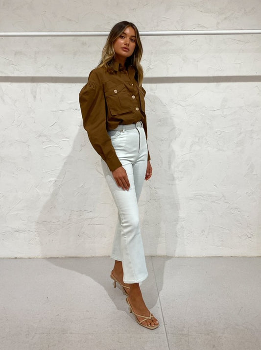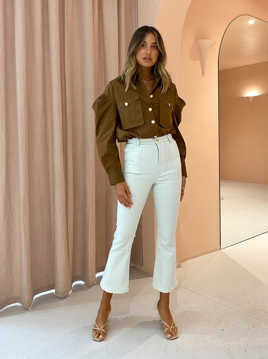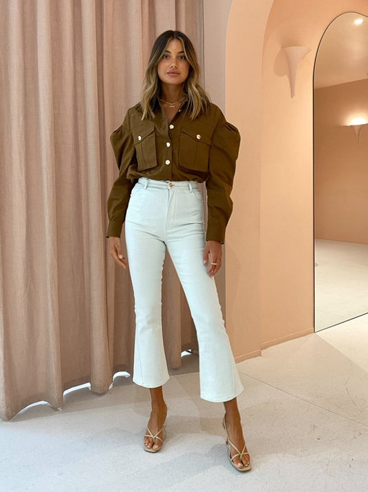 Designed to be worn high on the waist, this crop style with gold features will be the perfect neutral for your transeasonal styling.