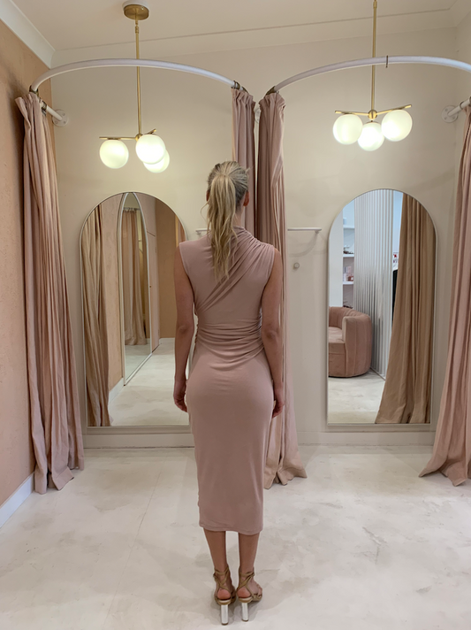 Acler's 'Palmer' ruched midi dress is designed with a fitted silhouette with a crossing front, cinched waist and ruching throughout.