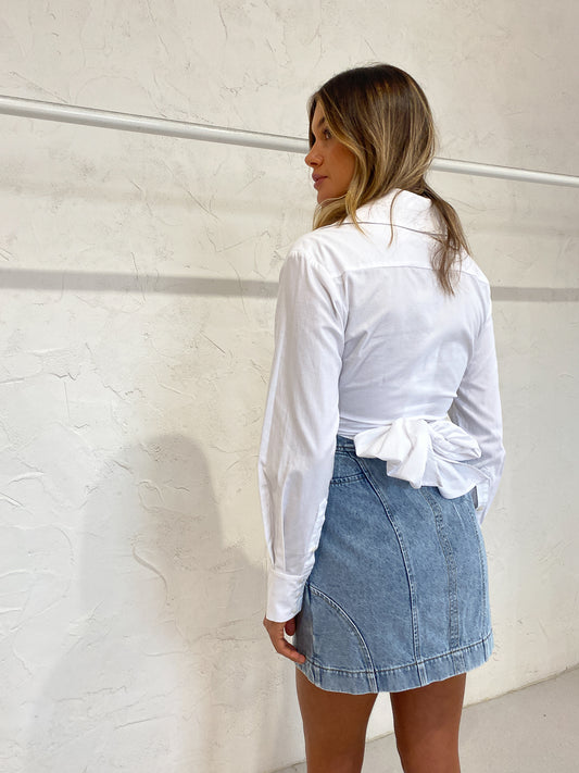 Crafted from a crisp cotton with a nostalgic nod to wrap-styles of the past, this cropped wrap shirt with tie can be styled your way to suit any Coco closet.
