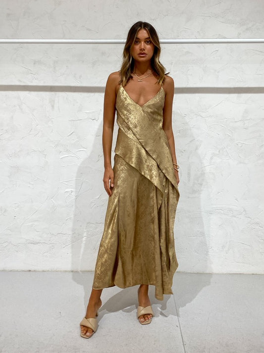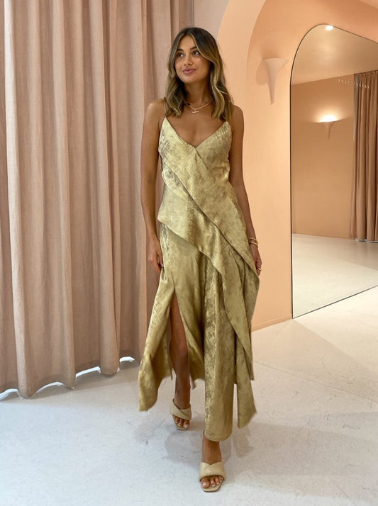 The Acler Station Dress in Gold radiates elegance and is the perfect statement piece for the upcoming party season.