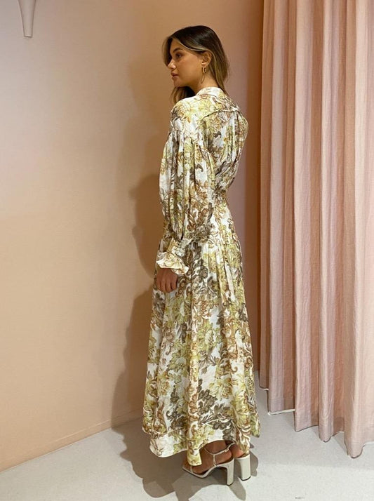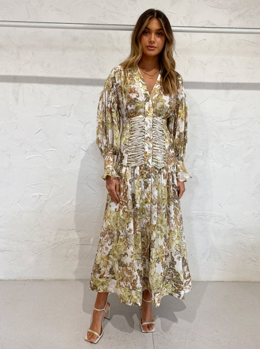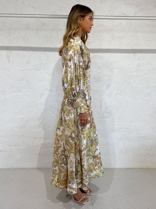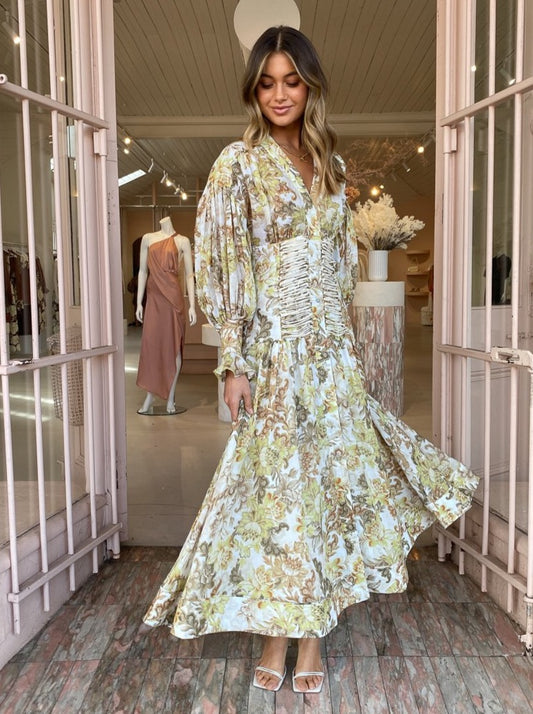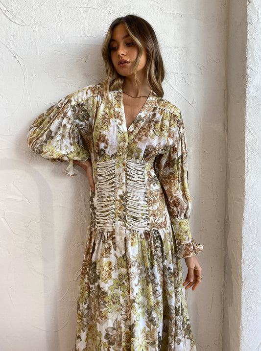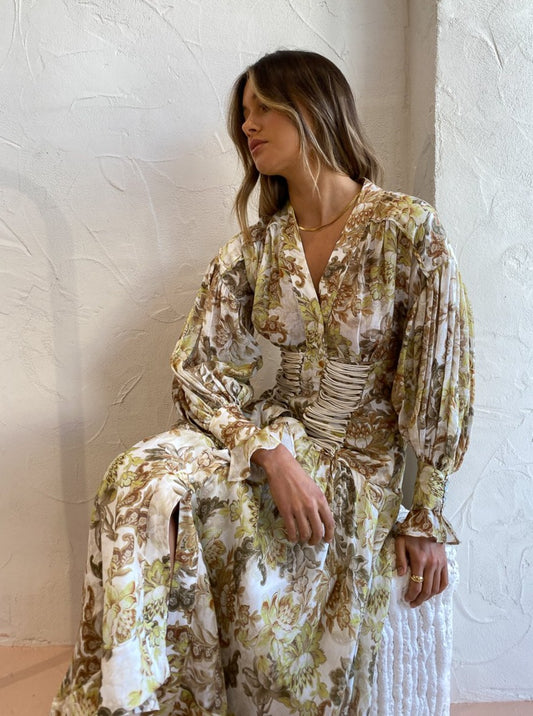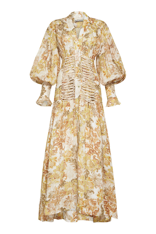 Thoughtfully designed from sustainable Ramie, the Bernadette is a timeless maxi length shirt dress with a detailed victorian inspired rope corset detail to accent the femme waistline. Featuring gathering detail at the shoulder, shell button detailing through the front placket and cuffs of the long blouson sleeves.