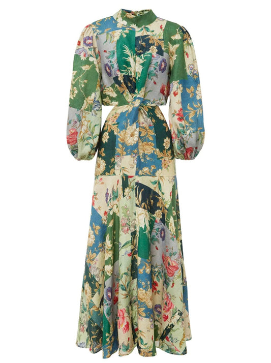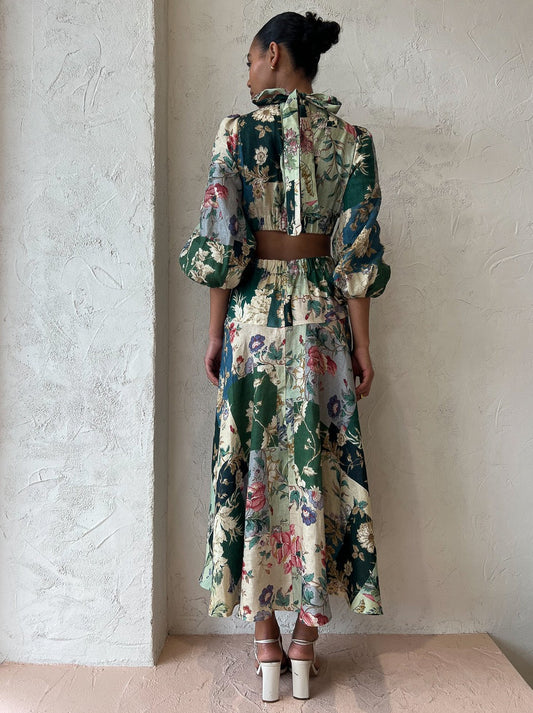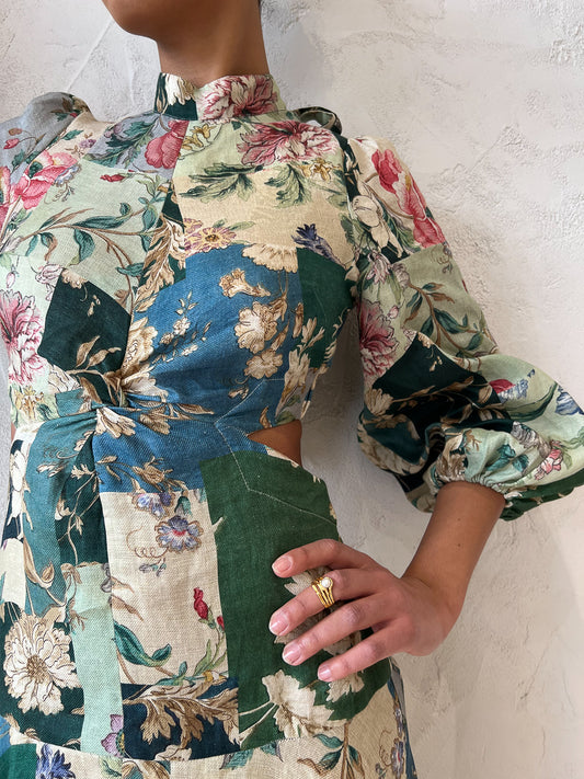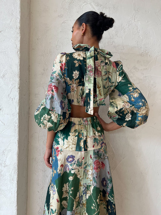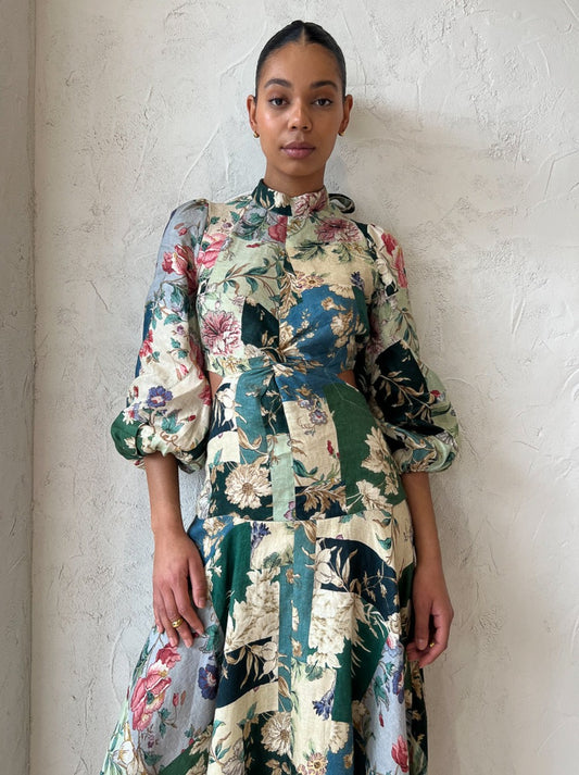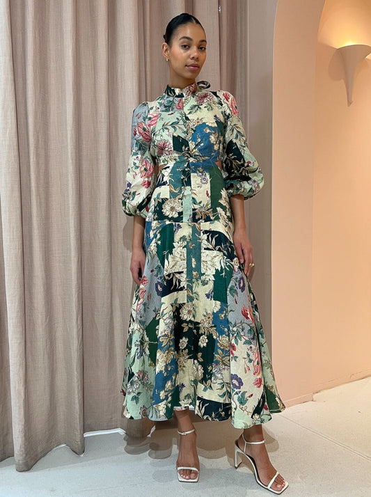 Thoughtfully crafted from a luxurious linen, this midi is printed in a vintage sage floral patch work. Sitting on the body in an A line silhouette it features balloon sleeves with fitted elasticated cuffs, a high neck with tie at back and twisted bodice detail with flattering waist cutouts that wrap around to an open back detail.