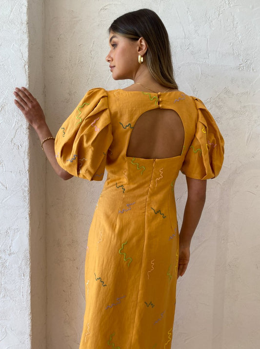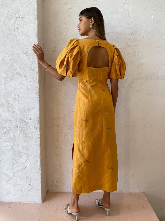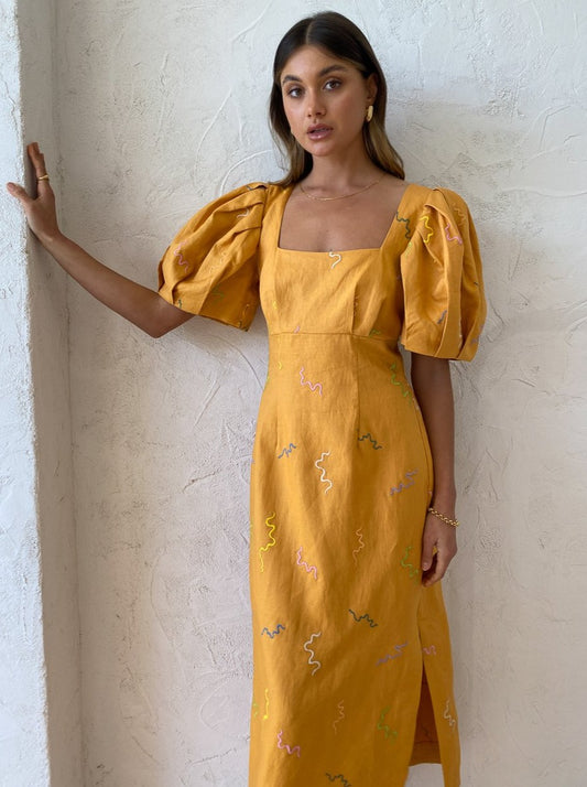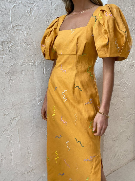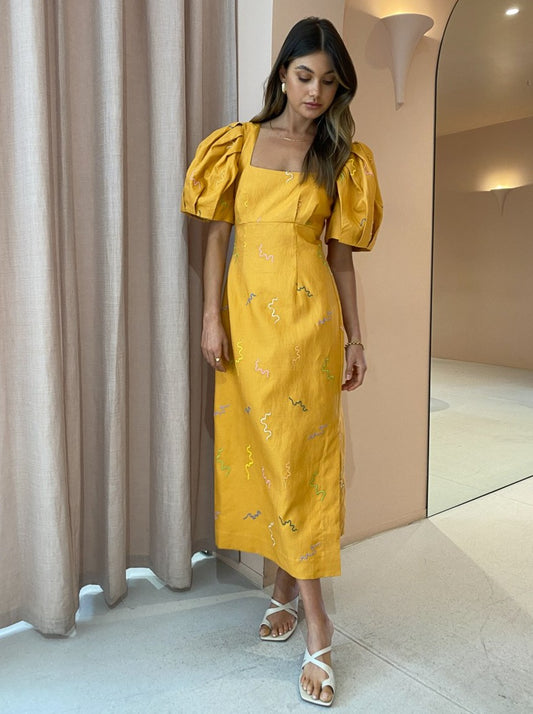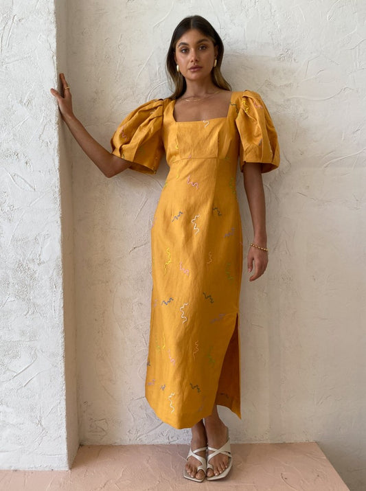 Absolutely adored for its golden hour inspired hue and playful embroidered detail, this midi dress will see you through twilight cocktails and birthday celebrations.