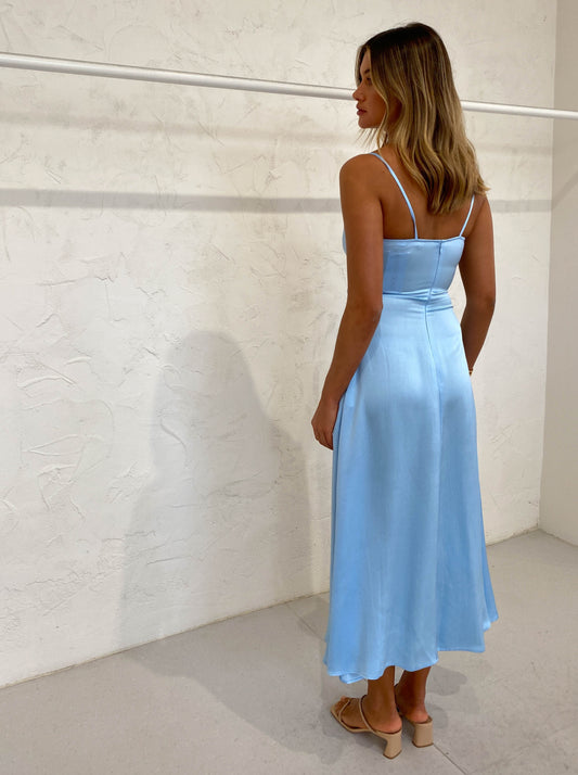Made in a stunning blue silk feel fabric, this piece showcases a double ring embellishment with a cut out under the bust for a point of difference.
