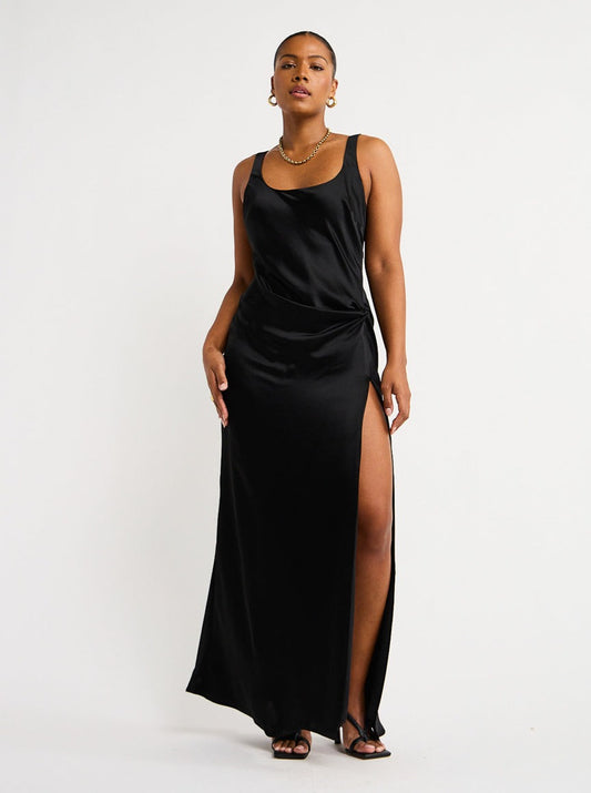 Crafted from a silky fabrication, this dress is cut on the bias and features a round neckline, gathering cinched at the side, fixed straps and a side split maxi skirt that drapes fluidly.