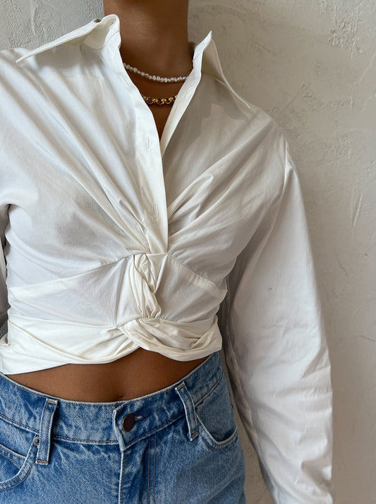 Crafted from a responsibly sourced Cotton blend fabrication, this artfully constructed shirt features a twisted front, V-neckline extended cuffs and an invisible zip at the back for entry.