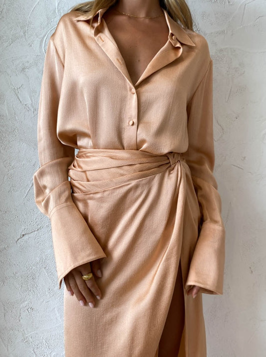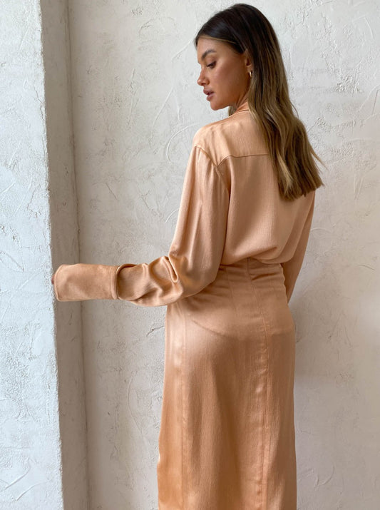 Coco girls love to style the Lana Shirt with the Eryn Shirt in Peach for a sophisticated tonal look for desk to dinner date styling or paired back with some denim for an effortlessly elevated everyday look.