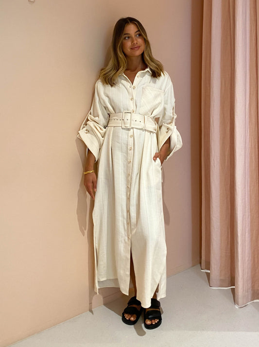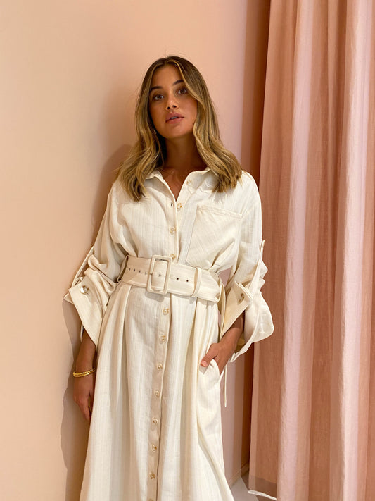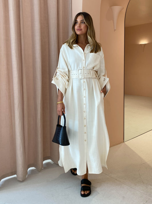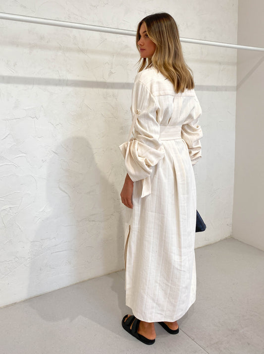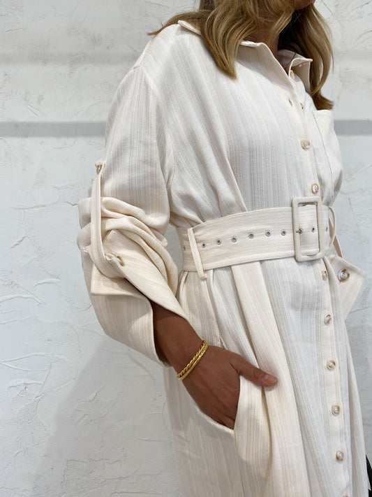 Made in a neutral striped linen blend fabric, this piece is relaxed in silhouette with a removable belt and wide feature sleeves that are able to be worn full length or buttoned up to short sleeve.