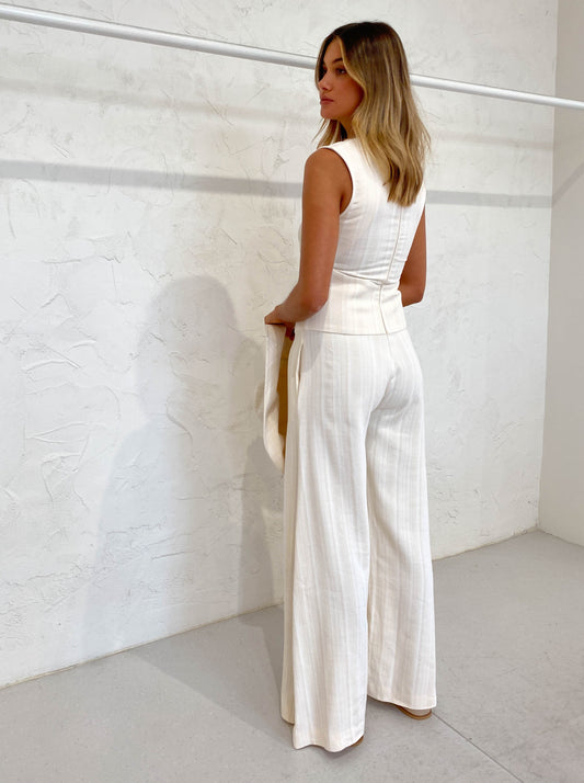 Made in a neutral striped linen blend fabric, this piece showcases a wide leg with a fitted waist and ring embellishment to bring it all together.