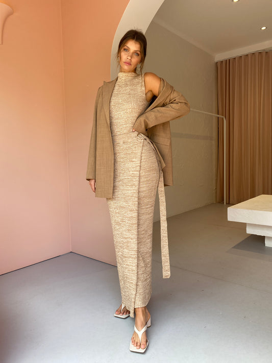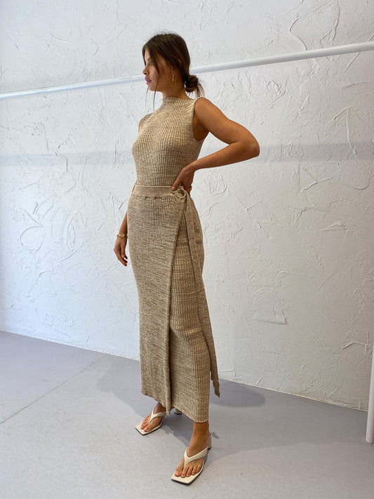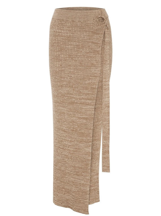 This knitted wrap midi skirt will pair beautifully with your classic white tee and white sneakers for a weekend look or match with other tonal pieces to eleveate for semi formal occassions.