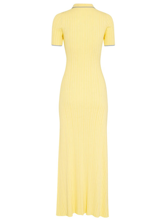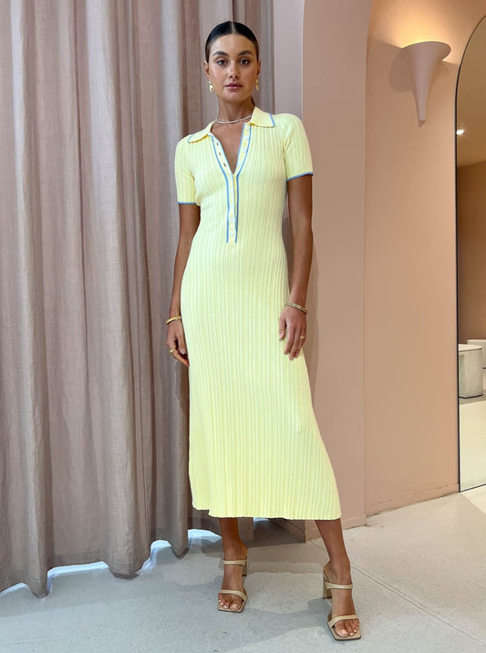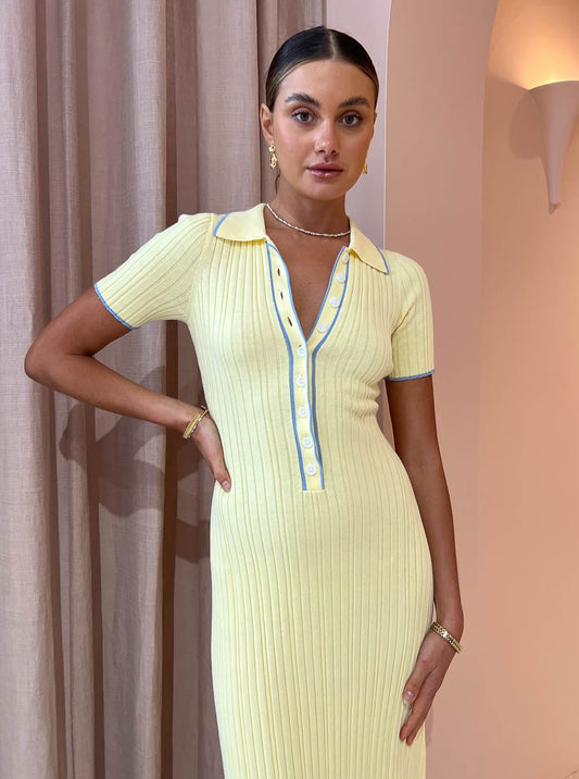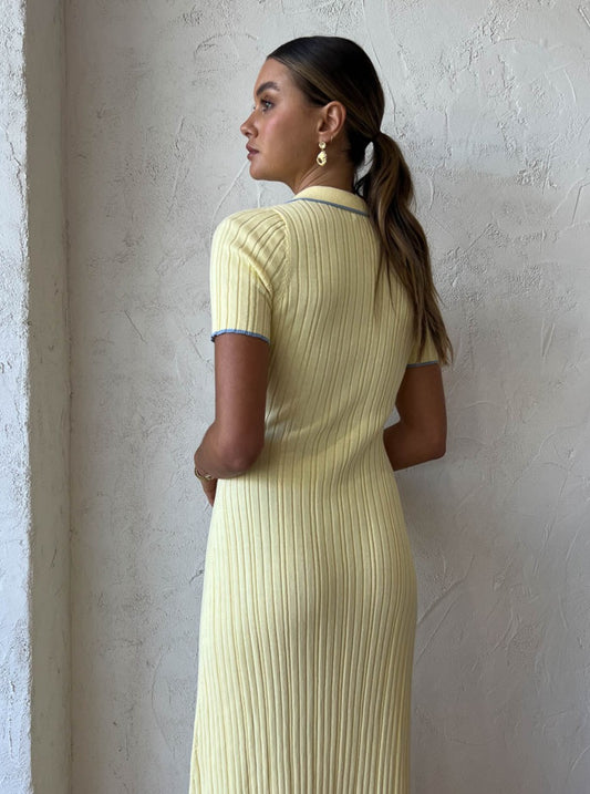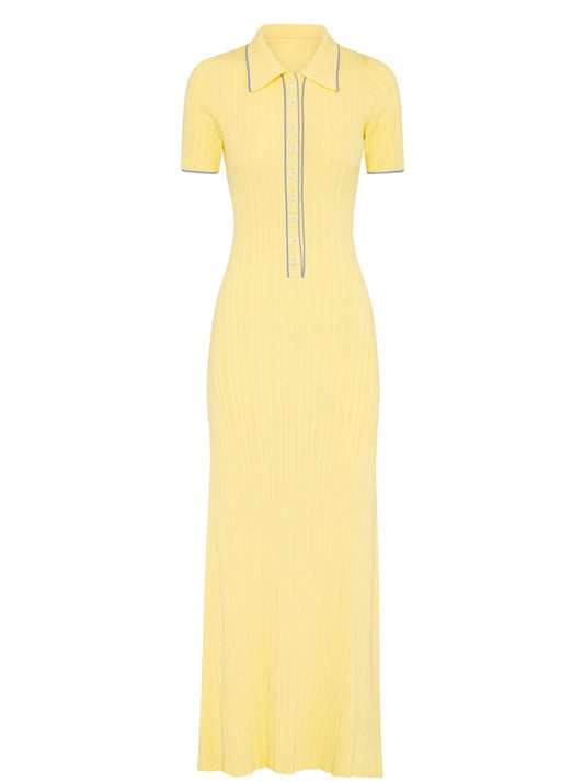 Crafted from a soft and breathable Cotton ribbed knit, this midi length dress with polo inspired styling skims and flatters the female form. Featuring short sleeves, collar and button down front before falling into a gently flared hemline.