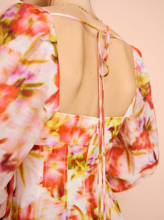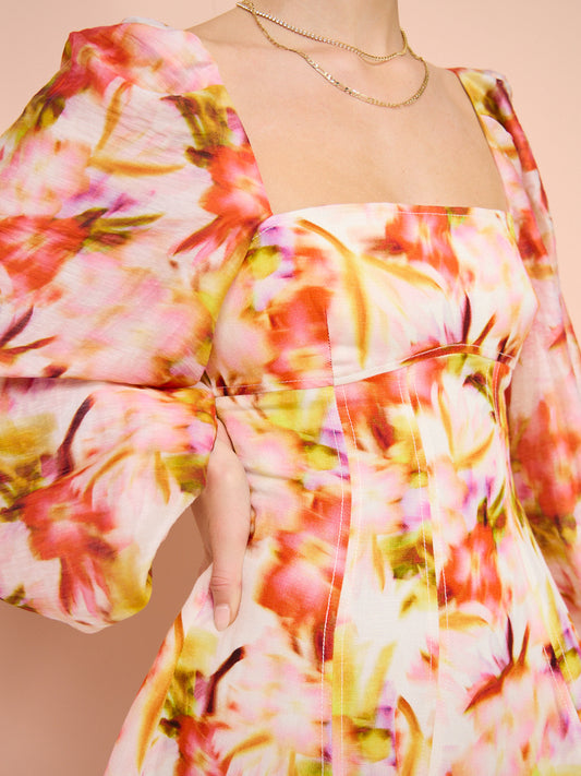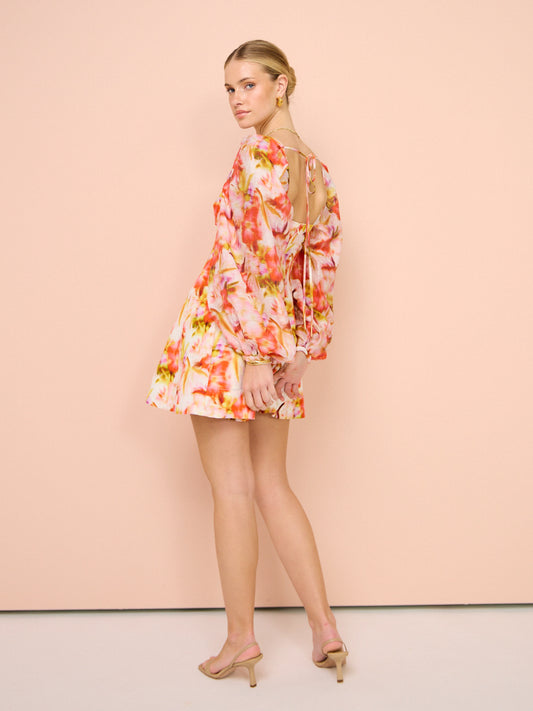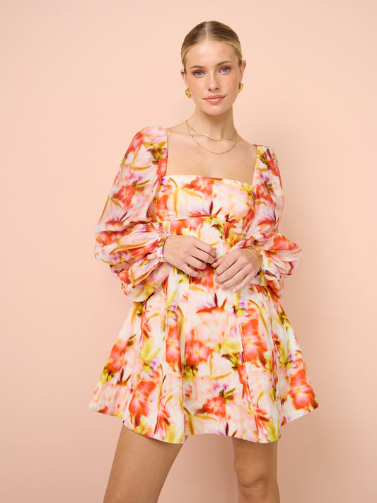 Crafted with a fitted bodice and relaxed skirt, this mini dress features full length blouson sleeves and a square neckline for a modern touch.