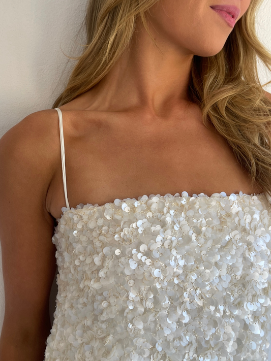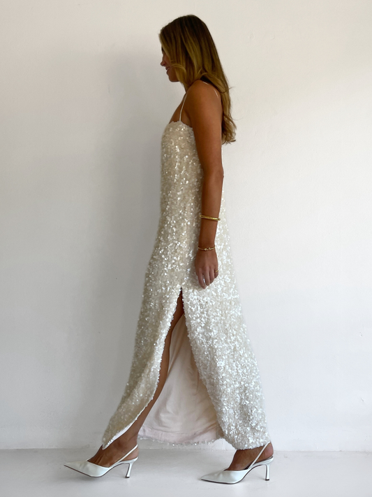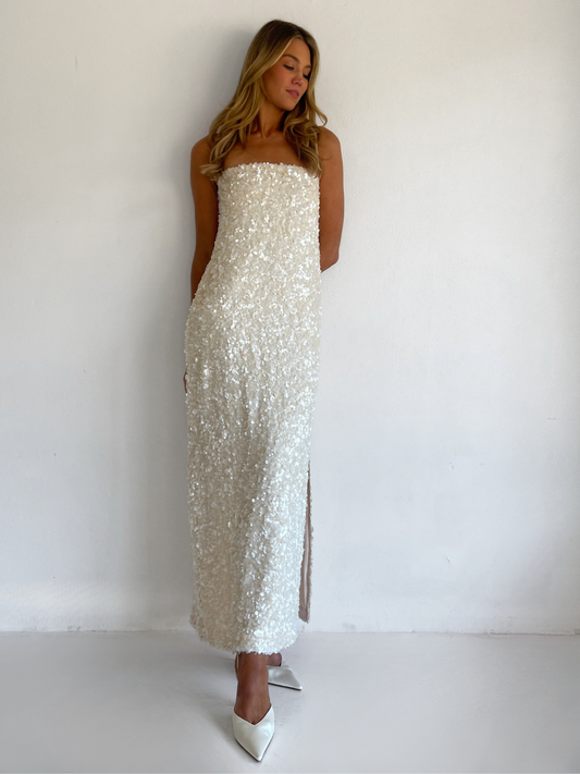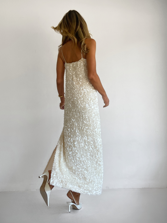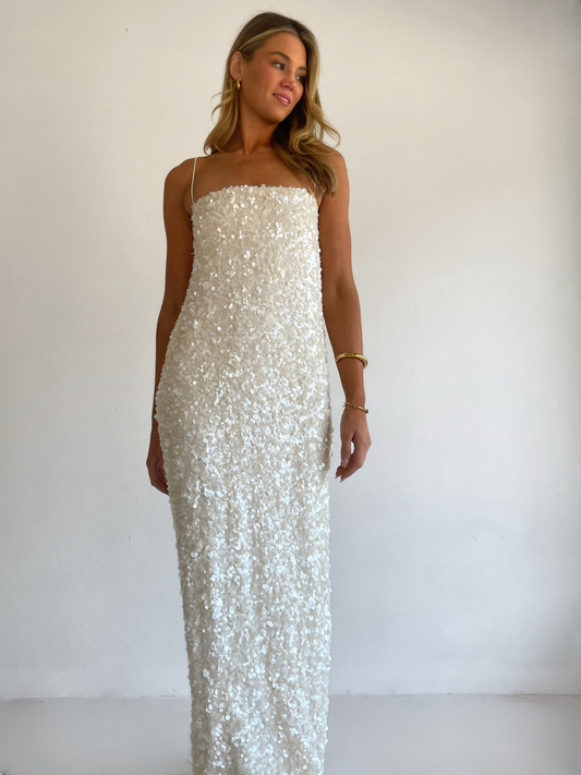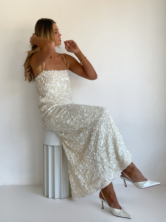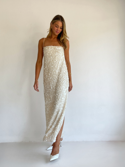 The Marsha Maxi Dress in Cream is made from a luxurious sequin with pearlescent sheen and silky woven rouleau straps. This style features an easy to wear column shape with side seam split.