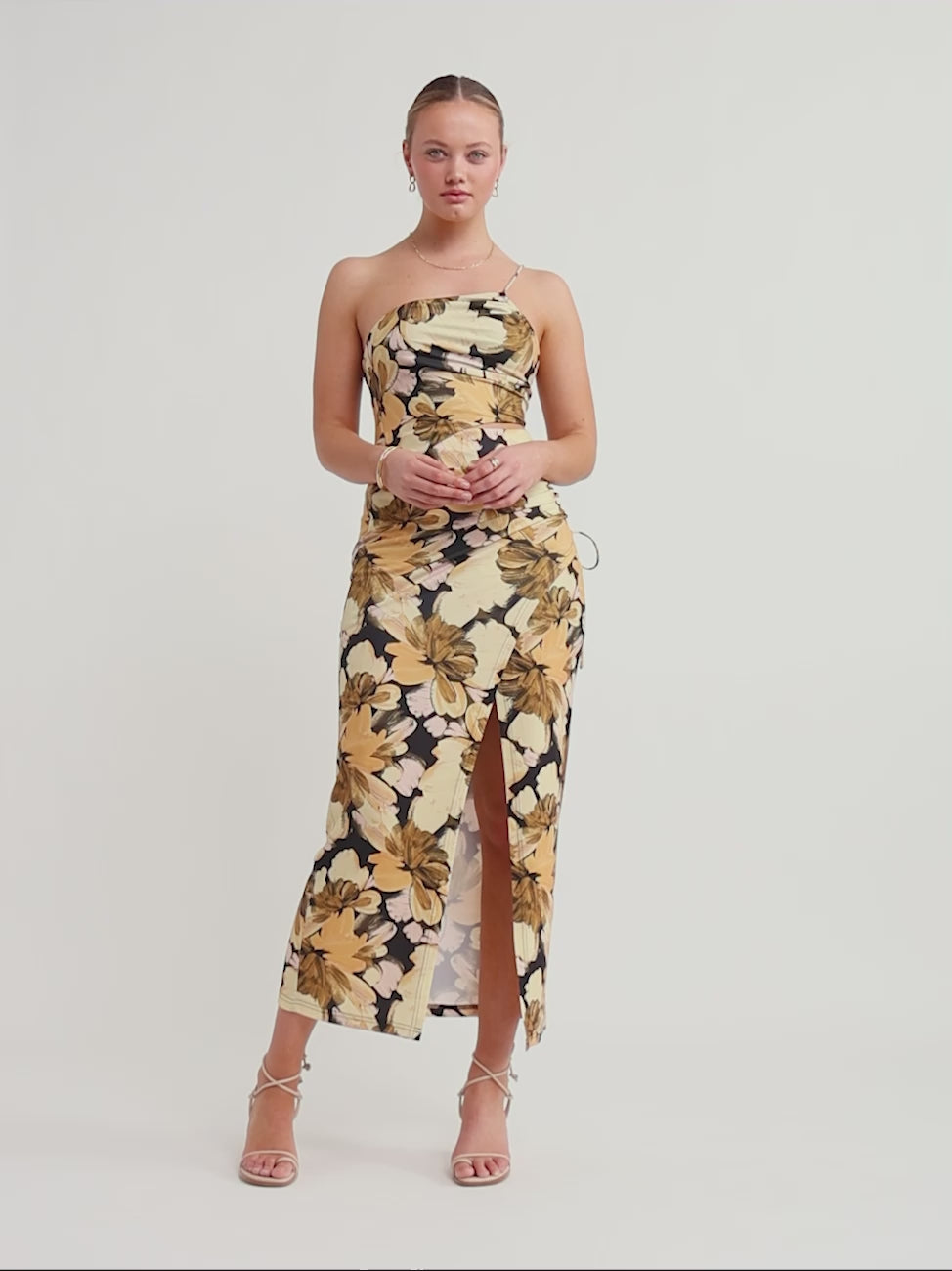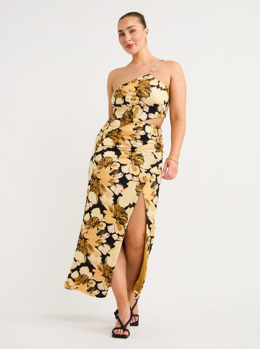 Detailed with its flattering yet abstract cut out detail at the bust and gathered over the hip, it is perfect for cocktail hour, birthday celebrations and formal occasions.