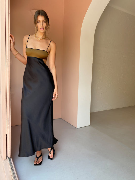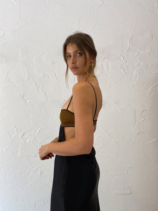 Crafted in a stunning two tone black and copper fabrication, this midi features a bandeau style bodice with plunging cowl back and cut out detail.