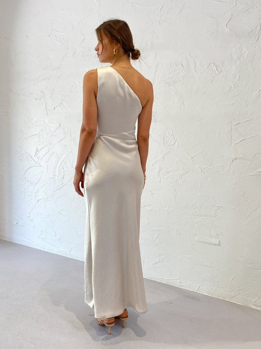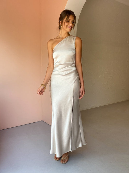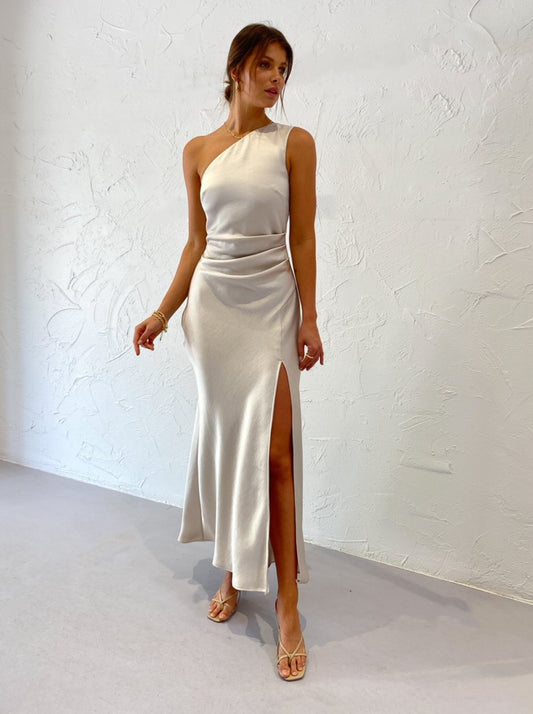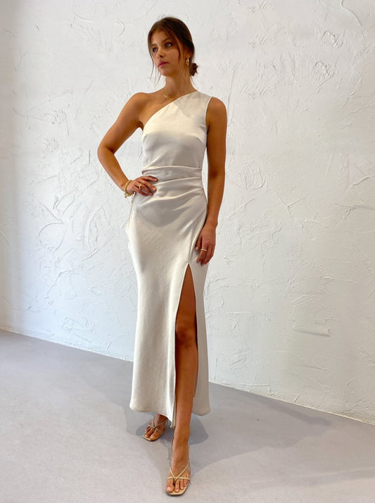 The Bec & Bridge Alegra Asym Midi Dress in Champagne is a classic one shoulder piece that will be a timeless addition to your wardrobe.