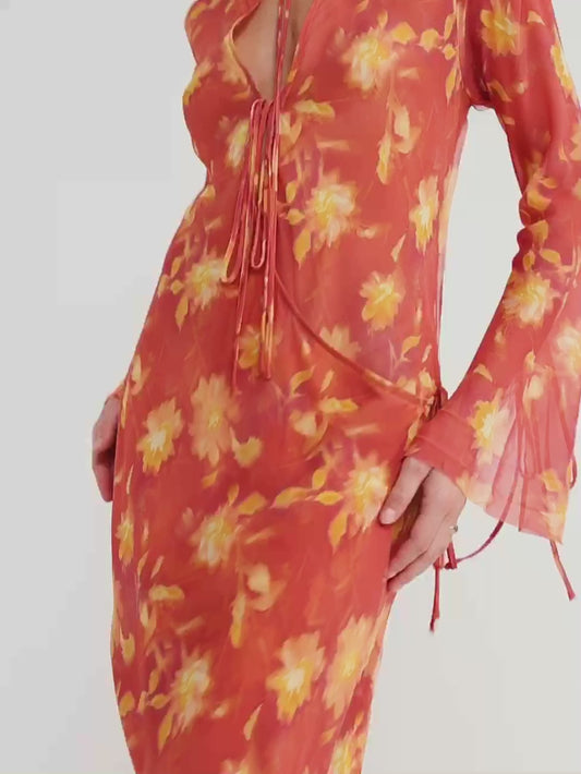 Crafted from a silk fabrication, this dress features a bias-cut crossover design, deep v neckline, delicate self ties throughout and a tie closure at the front.