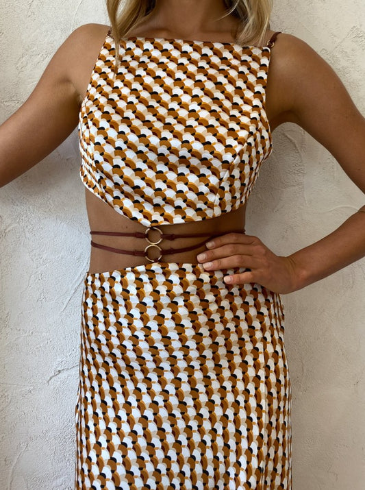 Making a statement with its retro inspired geometric print and strappy O-ring detail, the Casablanca Top can be paired with the matching Casablanca Maxi Skirt in Print for those special Coco moments or paired back with denim for those laid back sunset cocktails.