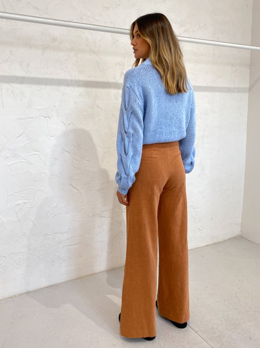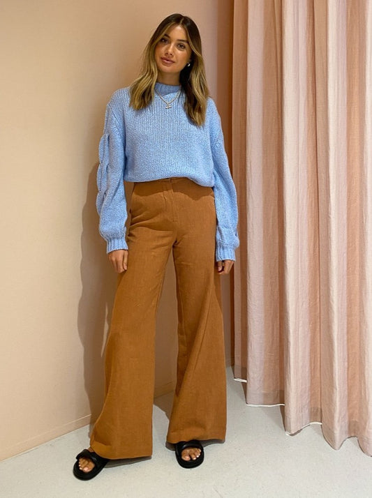 The Celeste Knit Jumper in Sky Blue from Bec & Bridge has us falling in love with 70's silhouettes in powder blue hues.