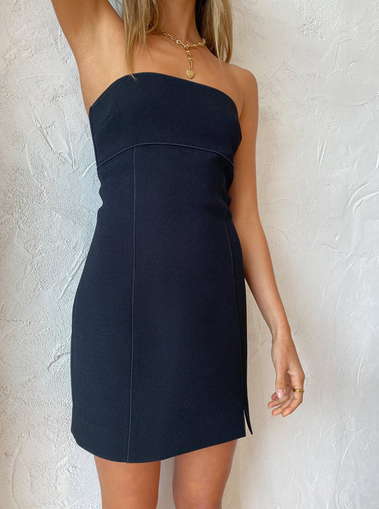 Cut to a strapless design, this mini dress is crafted from a luxe crepe fabrication and features panelling with statement stitch edging, a bandeau straight neckline and side leg split.