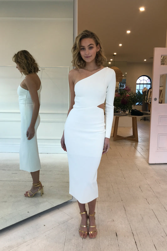 We love the Bec and Bridge Elke Asym midi dress. Crafted from bonded crepe, this asymmetrical midi dress features one sleeve on left hand side, asymmetrical neckline and waist cut out with shoulder tuck.