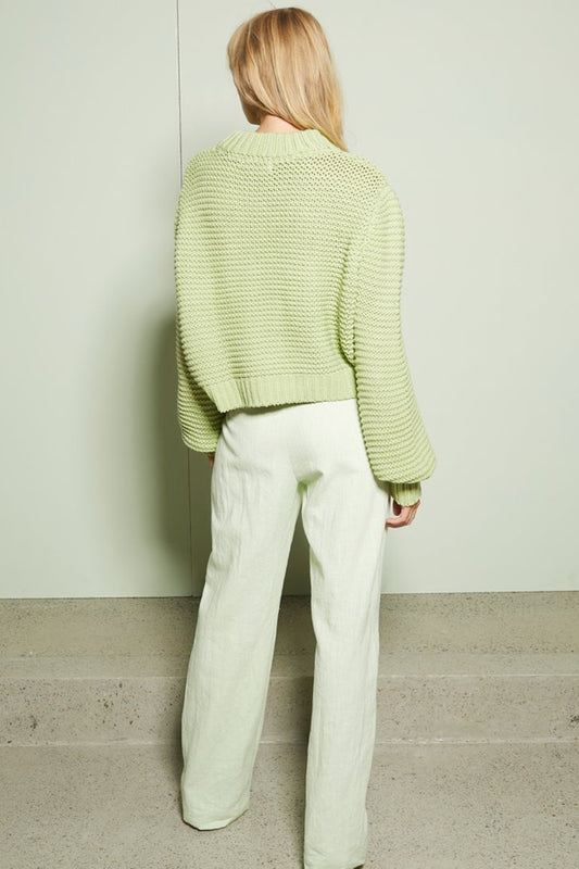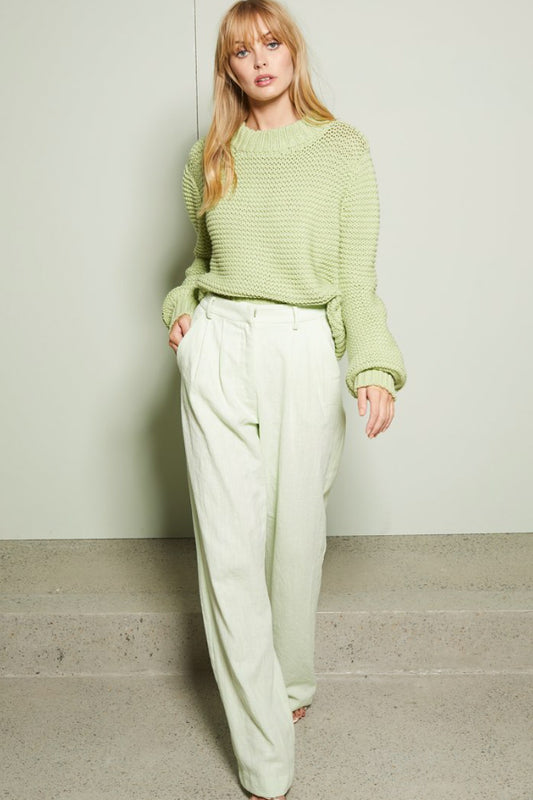Crafted from a ramie blend, the Harriet pants are a high waisted wide leg pant in a light lime colourway.