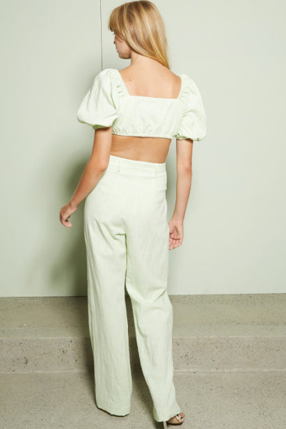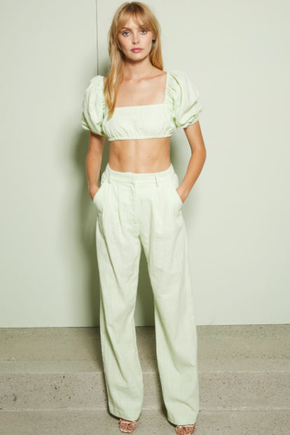 This light lime coloured crop features a square neckline with elasticated detail and statement bubble sleeves. Style with the Bec and Bridge 'Harriet' pant for a cute co-ord look.