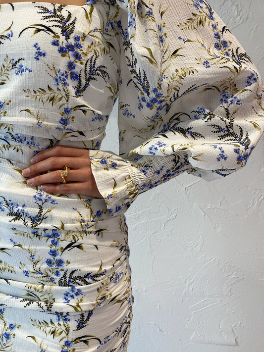 The feminine print, statement sleeve and feature back detail with rouleau lacing make this more than your typical mini dress.