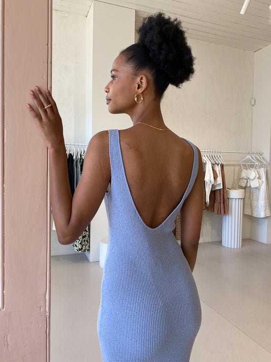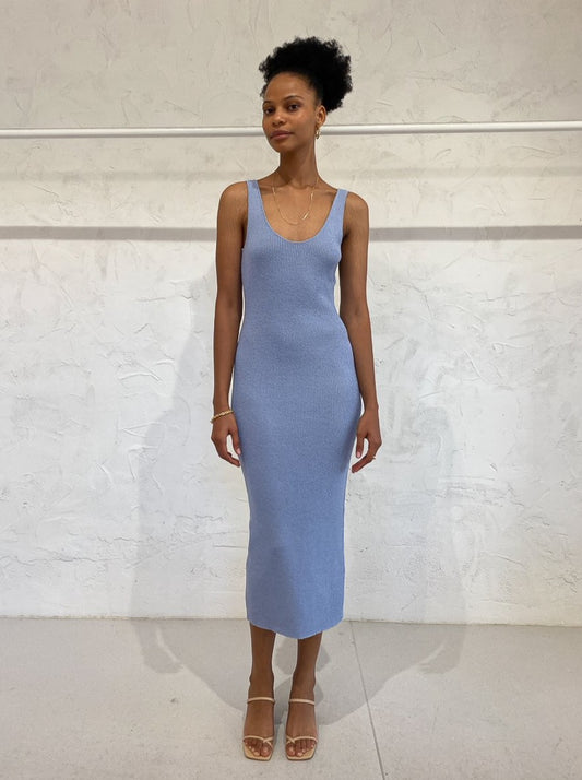 Designed in a dreamy shade of pale grey blue and a soft textured rib knit, this midi dress is bra friendly with a thick strap and scoop neck shape.
