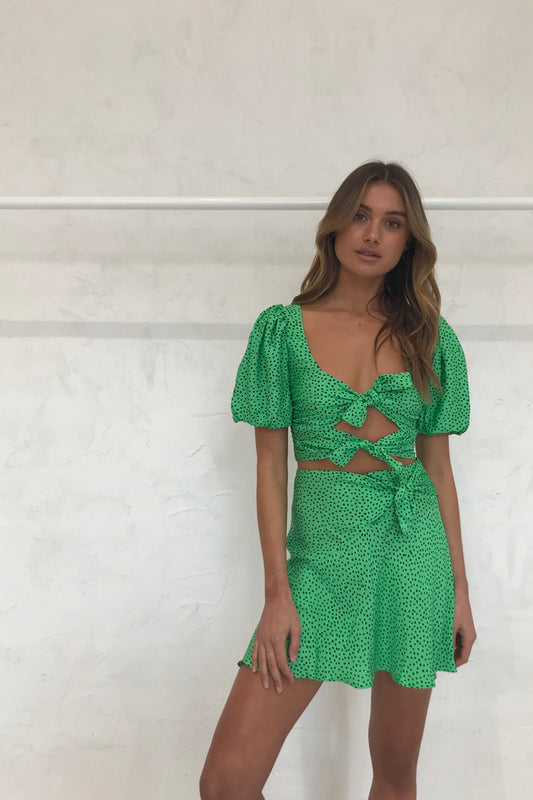 Wear this pebble printed deep green mini skirt with the COCO x Superga white sneakers or to dress it up style with our favourite Sol Sana 'Lily' Heel in Black.