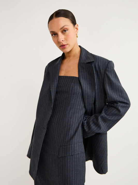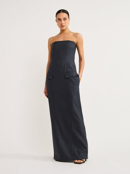 This Pine Strapless Maxi in Charcoal Pinstripe by Bec + Bridge is the perfect timeless addition to your wardrobe.