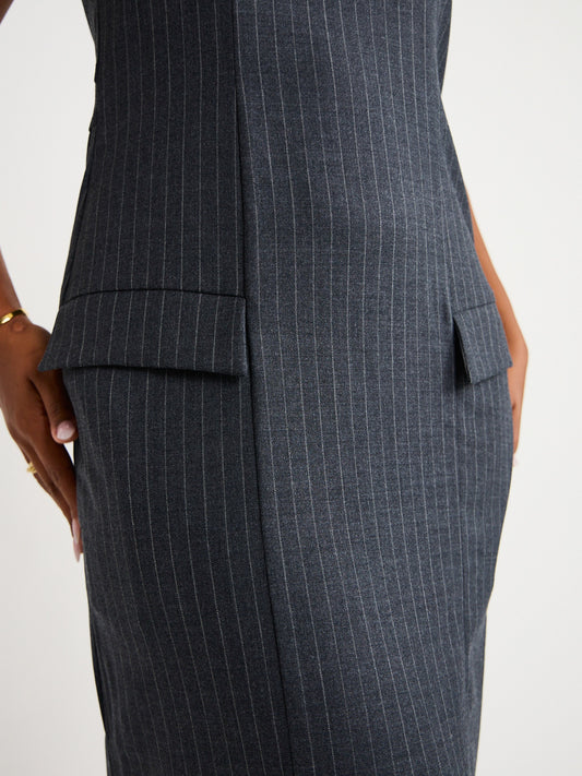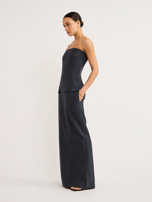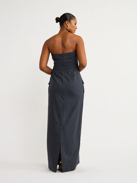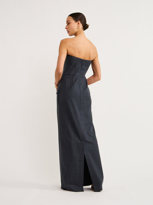 Bec and Bridge Pine Strapless Maxi in Charcoal Pinstripe