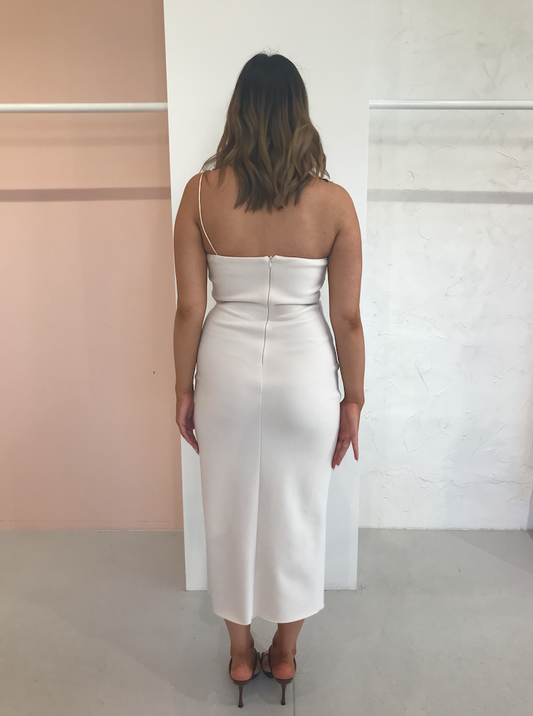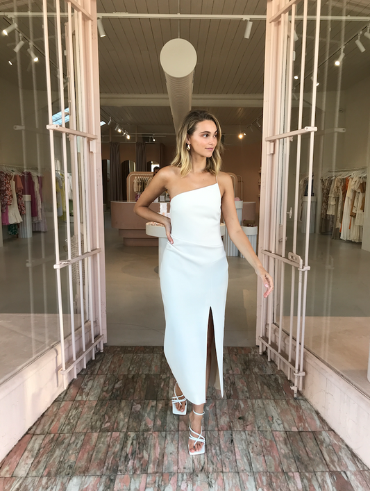 The Bec and Bridge Raphaela midi dress features an asymmetric neckline with one shoulder strap and subtle slide split.