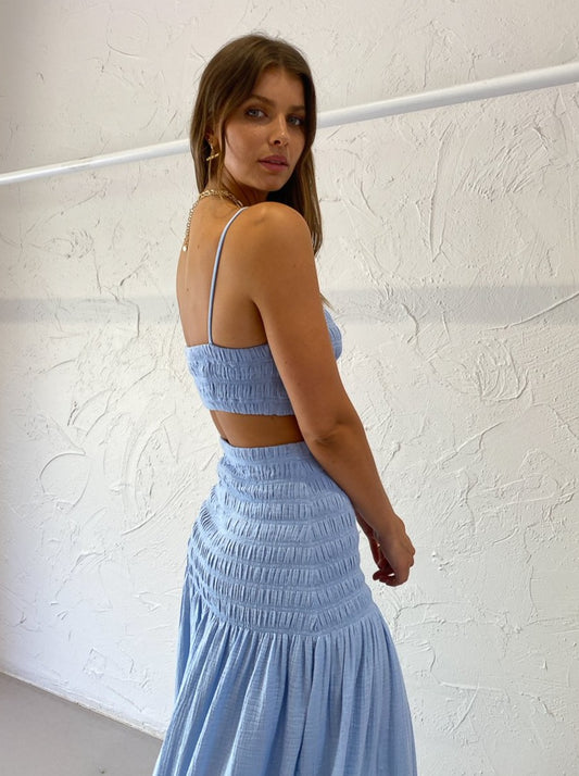 Crafted in a cotton baby blue fabric, shirring details with a high boat neckline and thin rouleau straps, this piece will pair back effortlessly with your existing pieces.