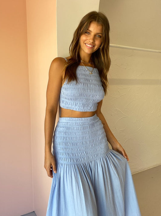 The Bec & Bridge Skye Dreamer Top in Sky Blue is the timeless, feminine and flattering crop to keep in your Coco wardrobe.