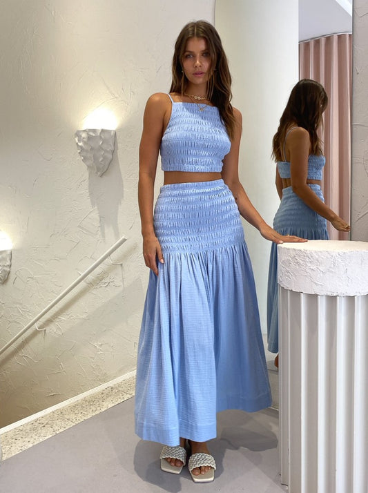 Coco Styling Tip: For an elevated set we love the Bec & Bridge Skye Dreamer Midi Skirt in Sky Blue.